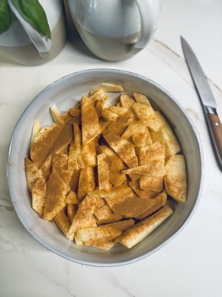 Kuori ja lohko omenat uuninkestävään vuokaan. Sirottele pinnalle kanelia maun mukaan.